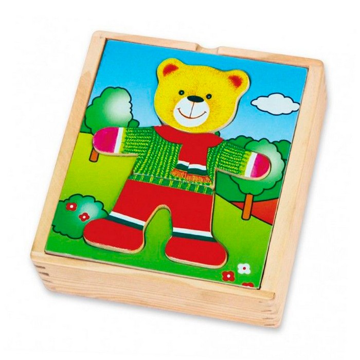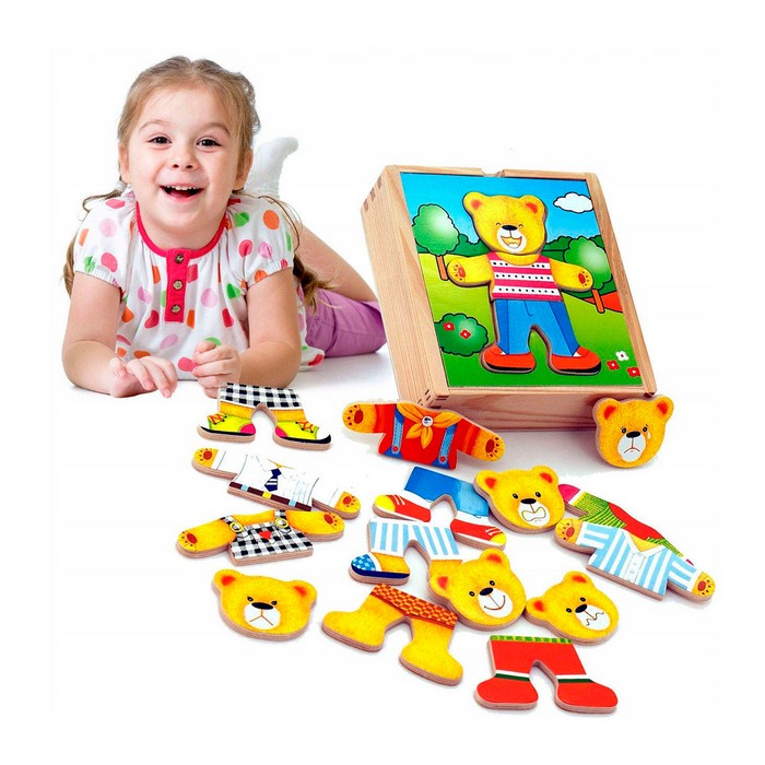 Wooden game, puzzle. The aim of the game is to teach the child to recognize the types of clothes.