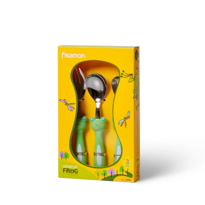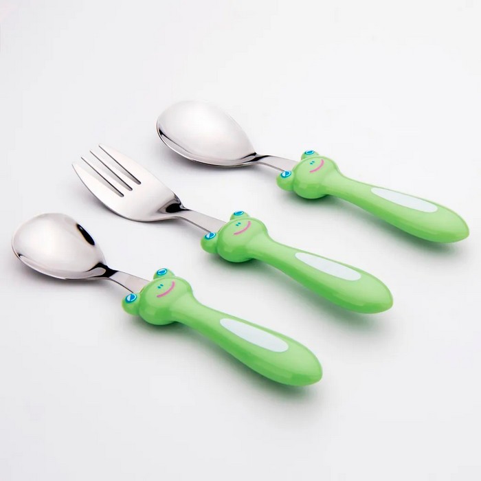 The set of 3 stainless steel cutlery "Frogs" is designed for safe and comfortable training of the baby to eat independently. The handles are made of plastic, non-slip and comfortable to hold with a child's palm.