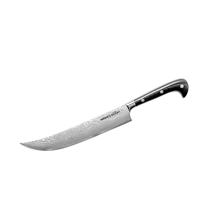 The SAMURA knives from the DAMASCUS series represent a perfect mix between Japanese design and Nordic European minimalism. The knives are made of Japanese damask steel, of the best quality that guarantees a perfect cut, with a hardness of HRC 61, which is a main feature for a truly premium knife. The knife handles have an ergonomic, slightly oval shape for a comfortable grip. Blade material : Damascus steel Size : 210mm Blade hardness : 61 HRC