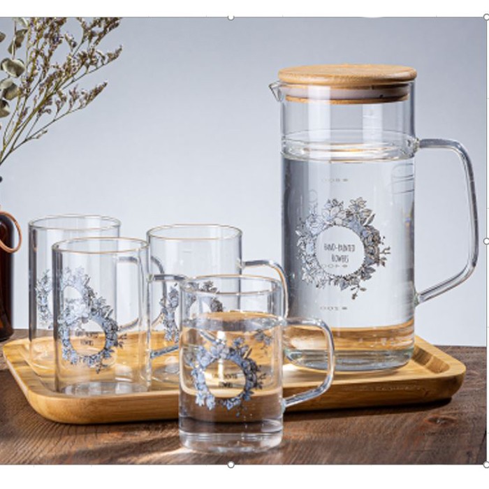 Jug set with 4 cups, GS, Glass, 1.2L, With lid, Bambus, With print, Transparent