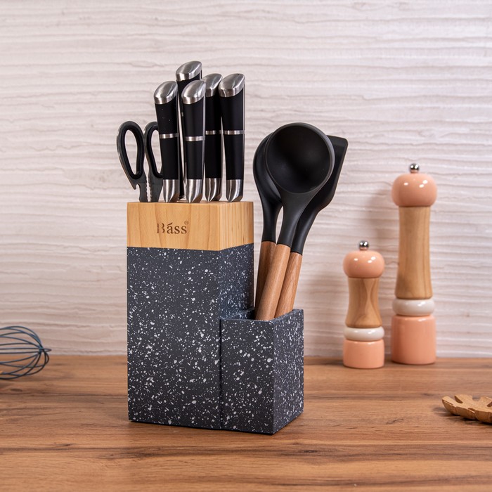 Set of knives and kitchen utensils with stand, BASS, 10 pieces, Wood/Plastic