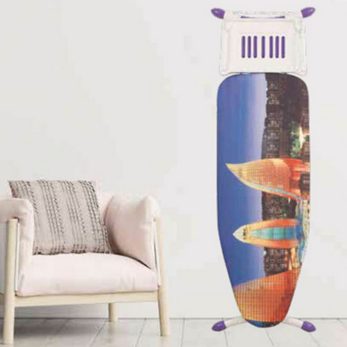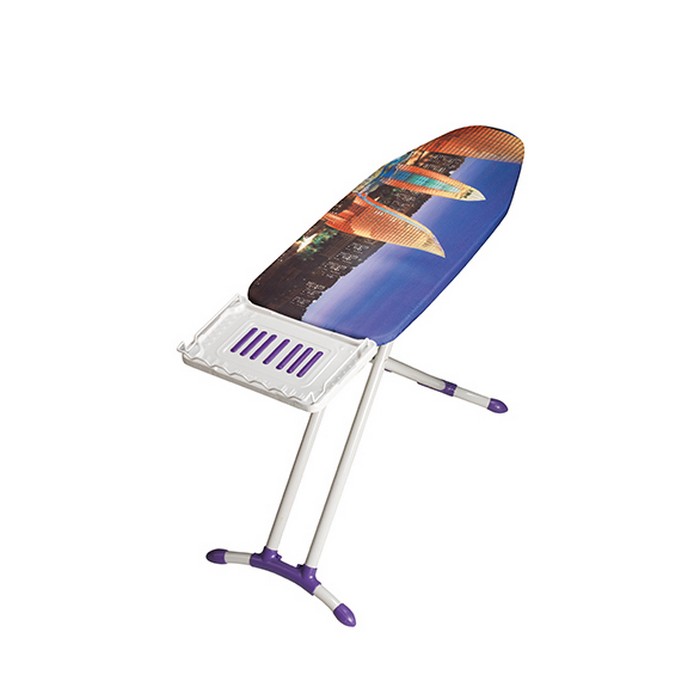The ironing board has a stable and robust frame with non-slip covers. The table is intended for intensive use, has a perforated metal mesh top especially for steaming and an iron support.