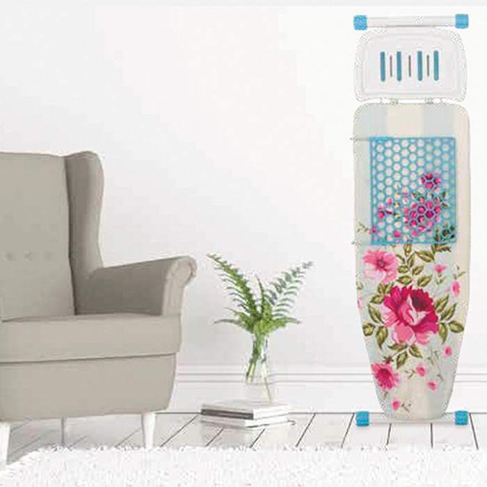 The ironing board has a stable and robust frame with non-slip covers. The table is intended for intensive use, has a perforated metal mesh top especially for steaming and an iron support.