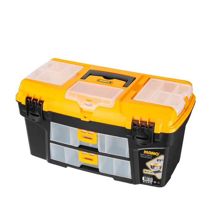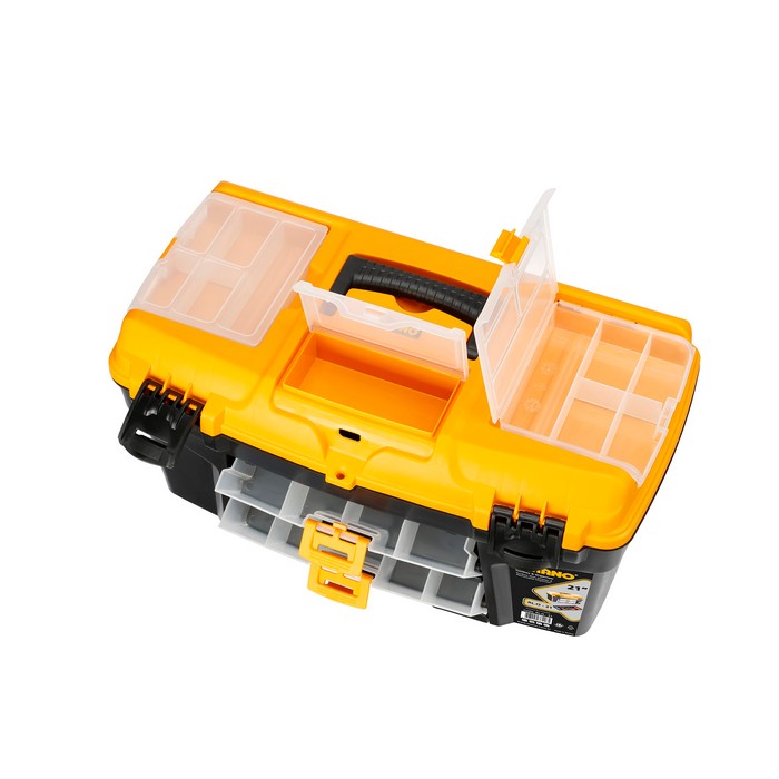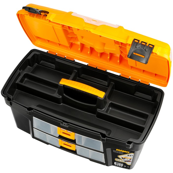 The multifunctional toolbox has a role in any home, garage, workshop or office. You can store in this small tools and accessories (nails, screws, etc.), which will help you maintain order and make the necessary things easy. The compartments at the top, a removable drawer with handle and a large box at the bottom, facilitate organization. It is equipped with a convenient carrying handle and two fasteners and is perfect for both beginners and professionals.