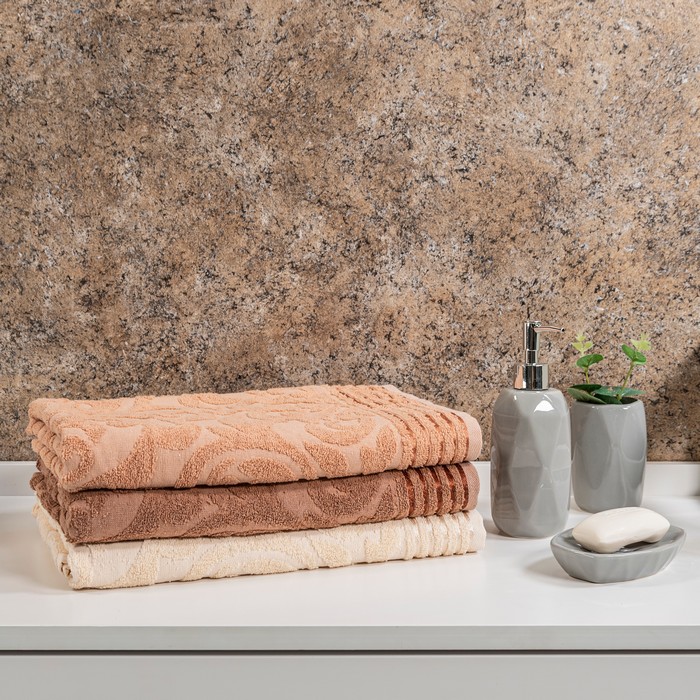 The bath towel is made of cotton, a natural and breathable material. Its properties include water absorption, durability, comfort and the ability to dry quickly.
