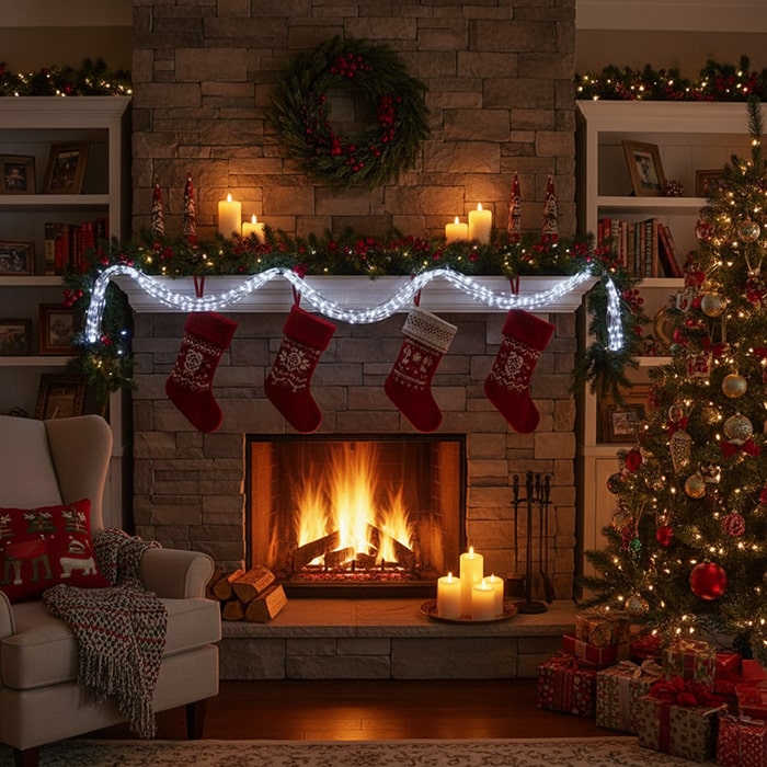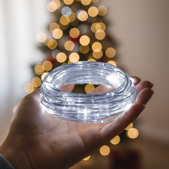 Light fixtures with copper wire, GLOBAL CHRISTMAS, 100 bulbs LED, 10 m, White, Batteries, Cold Ligh