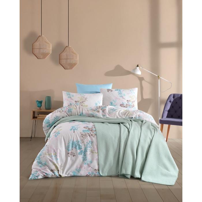 Bed linen set with blanket, NAZENIN, 5 pcs, 220x240cm, 200x220cm, 240x260cm, 50x70cm, Cotton, Mint