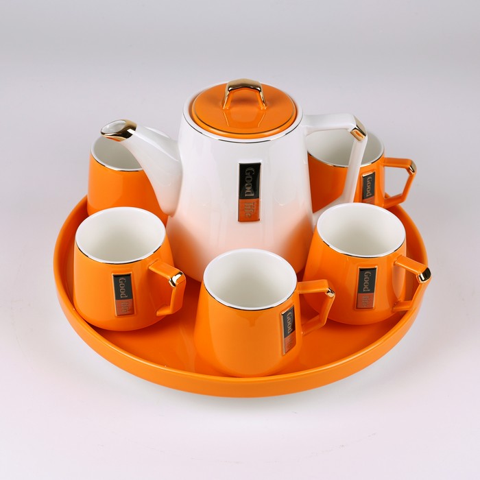 Tea set, GS, 8 pcs, Porcelain, White/Orange