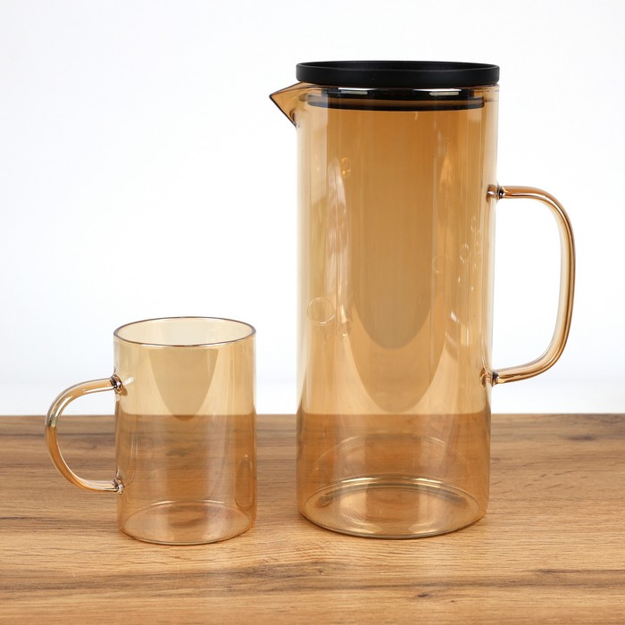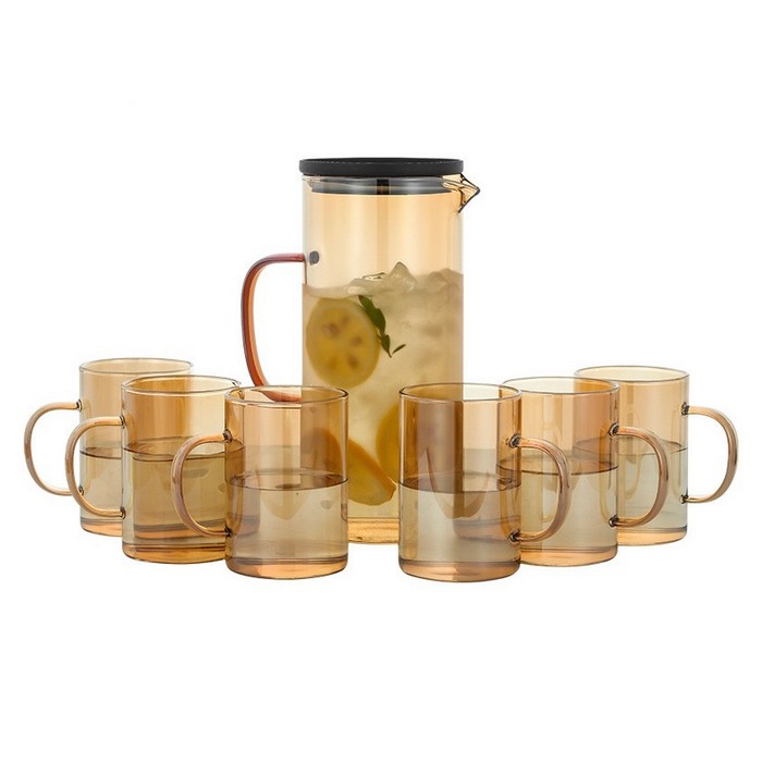 Set of jug with glasses, NO NAME, 7 pieces, Glass, Golden, With lid
