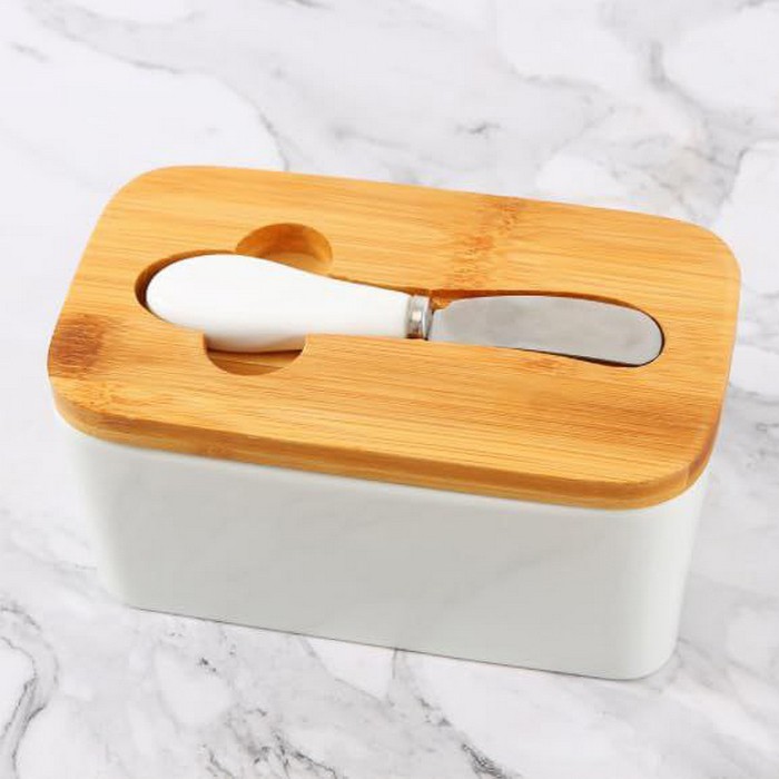Butter dish with knife, GS, Ceramics/Bamboo, White