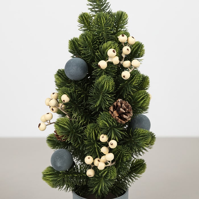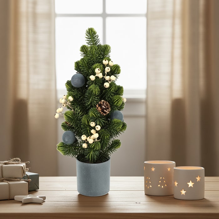 An artificial Christmas tree decorated with berries, pine cones, and baubles is perfect for adding a festive touch to your home. Placed in a pot, it sits neatly on windowsills, shelves, or tables, providing Christmas decor that easily blends into any room.