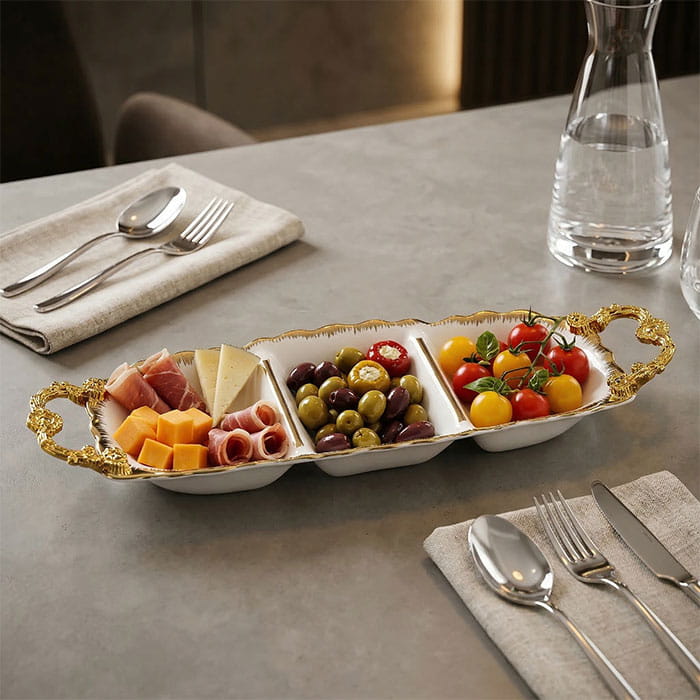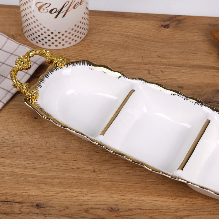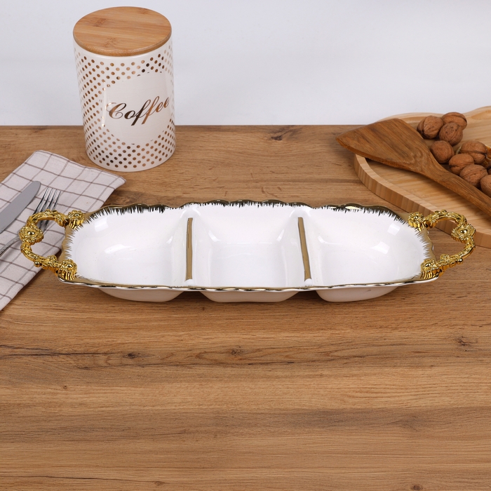 Platter, GS, Porcelain, White/Golden, 44.5x14x6.5 cm, 3 compartiments, HANDLES, Aperitif plate, Appetizers