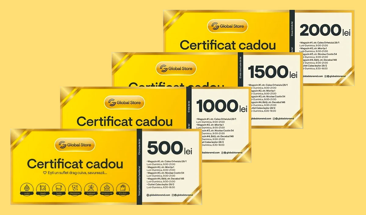 La Global Store găsiți certificate pentru orice buget, începând de la 300 MDL și 400 MDL pentru mici atenții, până la 1000 MDL, 1500 MDL și 2000 MDL pentru cadouri substanțiale.