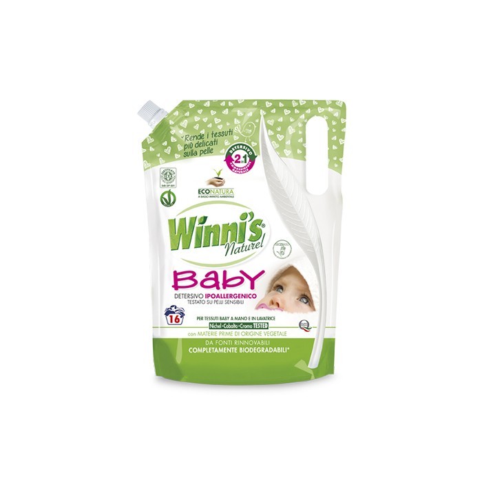 Detergentul de rufe Winni’s este indicat pentru orice tip de fibră. Hipoalergenic: formula sa a fost studiată pentru a reduce la minim o posibilă apariţie a alergiilor. Produs a fost supus testului Nichel, Cobalt şi Crom. Nu conţine fosfor și coloranţi. Volum : 800ml Numar spalari : 16 (spalari) Tip rufe : Copii Aroma : Flori Ambalajul : Doi-pak Textura : Lichid