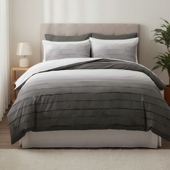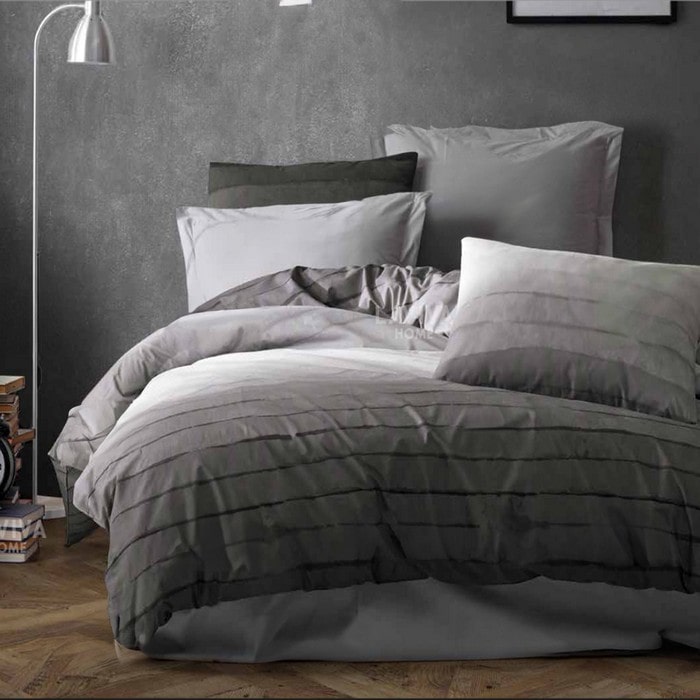 Lenjerie de pat iarna-vara, HALLEY HOME, 4 piese, Double Size, 240x260cm, 200x220cm, 50x70cm, Bumbac in amestec, Gri, Dungi orizontale, Turcia