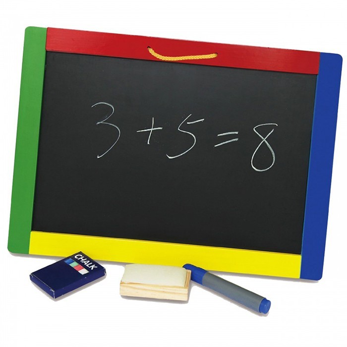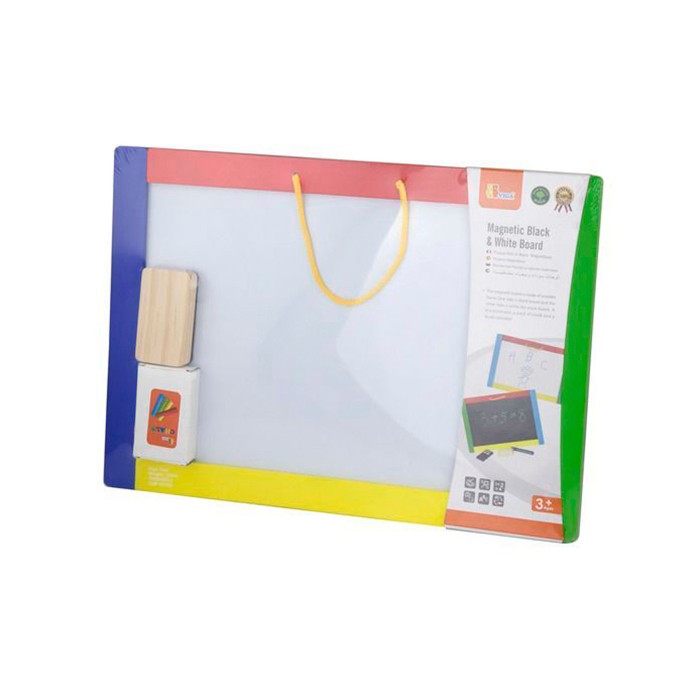 Șevalet colorat din lemn cu tablă albă magnetică și o tabla neagra de scris, poate fi sprijinit pe masă.