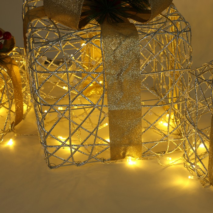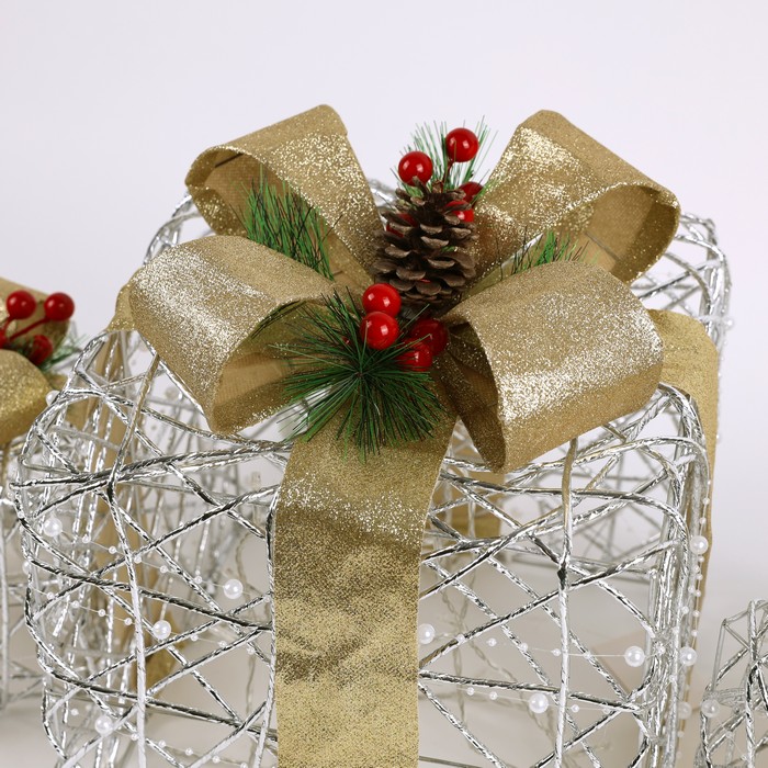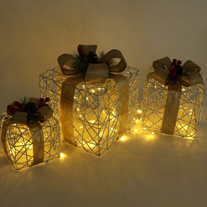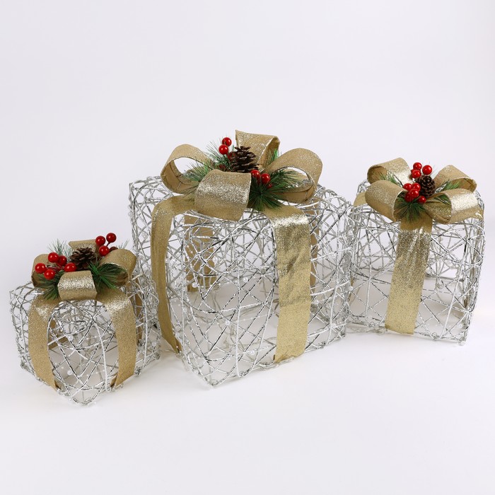 Set 3 cutii decorative de craciun, GS, Becuri LED, 15cm, 20cm, 25cm, Culori in asortiment