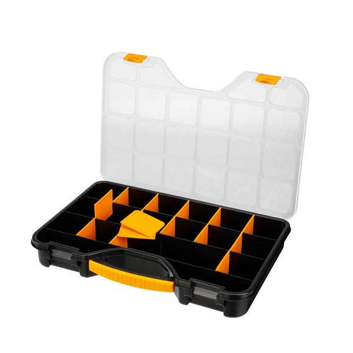 Cutia de instrumente multifuncțională are un rol in orice locuință, garaj, atelier sau birou. Puteți stoca in aceasta unelte si accesorii mici (cuie, șuruburi etc.), care va vor ajuta sa mențineți ordinea si sa faceți lucrurile necesare ușor. Compartimentele din partea de sus, un sertar detașabil cu mâner si o caseta mare in partea de jos, facilitează organizarea. Este echipat cu un mâner convenabil de transport si doua elemente de fixare si este perfecta atât pentru începători, cat si pentru profesioniști.