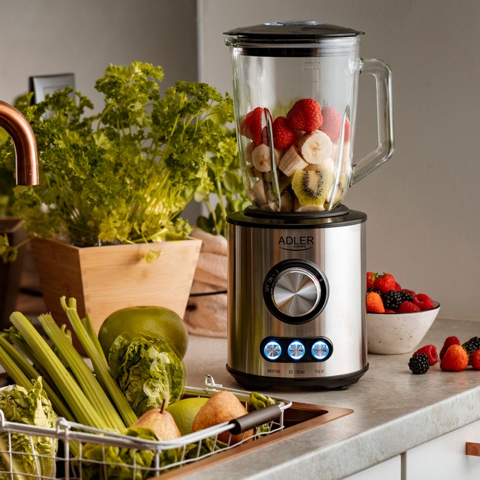 Blender cu pahar cu putere de 1700 W pentru mâcinarea și amestecarea eficientă și rapidă a produselor alimentare. 2 nivele de viteză, accesați amestecarea cu intensitate diferite. În plus, există 3 funcții: smoothie, zdrobire de gheață, puls. Blenderul este echipat cu un pahar de 1,5 litri, vas de curățare și o lamă rezistentă din oțel inoxidabil.