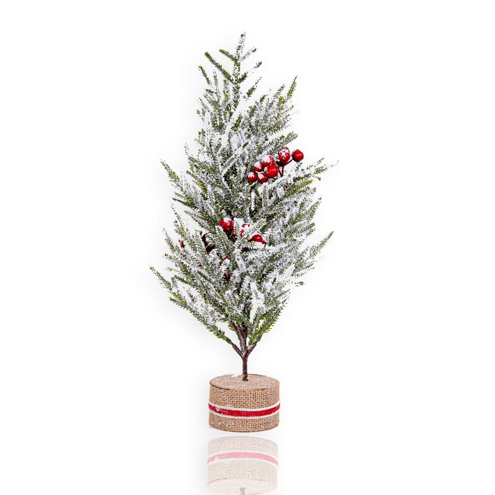 Brad decorativ de masa, GLOBAL CHRISTMAS, Plastic, 40cm, Inzapezit, Conuri si Pomusoare, Verde/Rosu