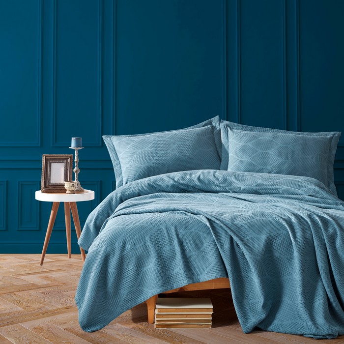 Set cuvertura cu fete de perna, SAHESER, Double Size, 220x240cm, 50x70cm, Bumbac, Albastru