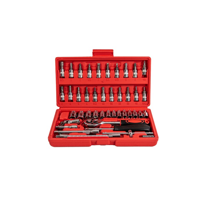 Contine: - 1 x clichet 6,3 mm (1/4"); - 2 x prelungitor 50 + 100; - 1 x maner surubelnita 6,3 mm (1/4"); - 1 x adaptor T 6,3 mm (1/4"), 100 mm; - 1 x prelungitor flexibil 6,3 mm (1/4"), 150 mm; - 1 x cardan 6,3 mm (1/4"); - 4 x imbus: 1.27; 1.5; 2.0; 2.5 mm; - 13 x tubulare 6,3 mm (1/4"): 4; 4.5; 5; 5.5; 6; 7; 8; 9; 10; 11; 12; 13; 14 mm; - 1 x adaptor biti 6,3 mm (1/4"); - 21 x biti: 3 x soclu: 4; 5.5; 6.5 mm; 3 x phillips: PH1; PH2; PH3; 3 x torx: PZ1; PZ2;PZ3; 6 x profil T: T10; T15; T20; T25; T30; T40; 6 x hexagon: 2; 2.5; 3; 4; 5; 6 mm;