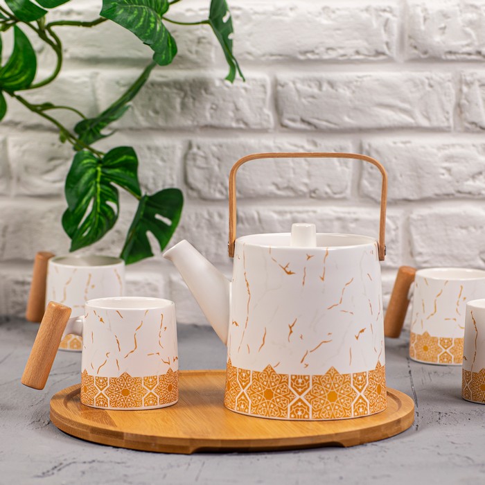 Set ceai, GLOBAL STORE, Ceramica, Alb/Cafeniu, 1L, 250ml