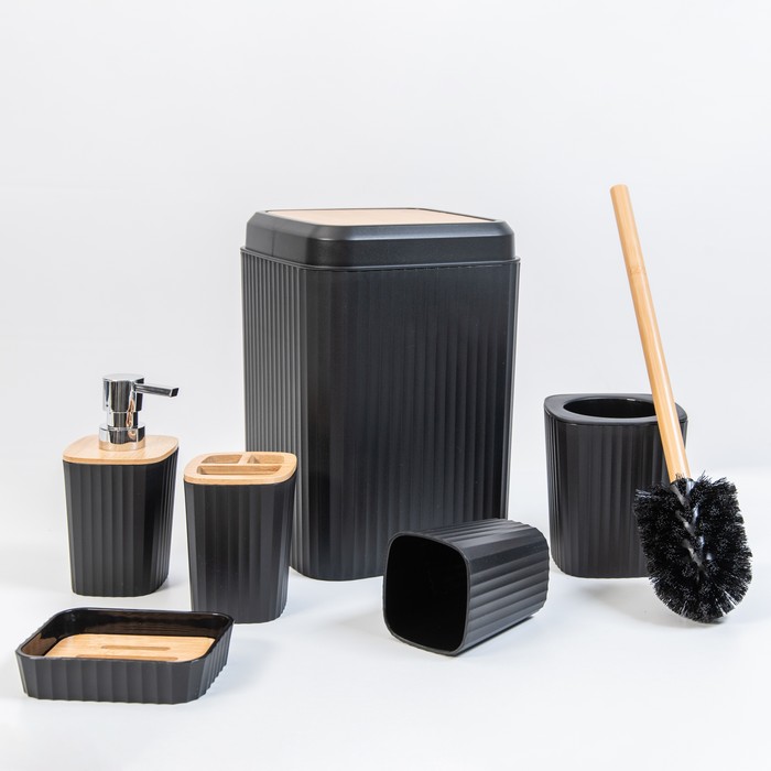 Set 6 accesorii baie, CHIJANG, Plastic/Bambus, Negru, 24x19.5x19 cm