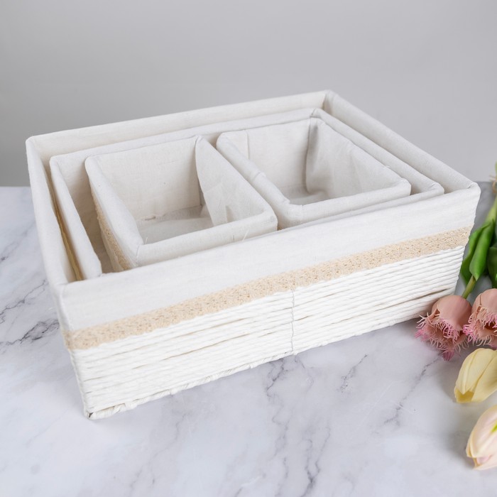 Set 4 cosuri decorative, GS, Ratan/Textil, 40x30x15 cm, 35x25x13 cm, 20x14x11 cm, Alb