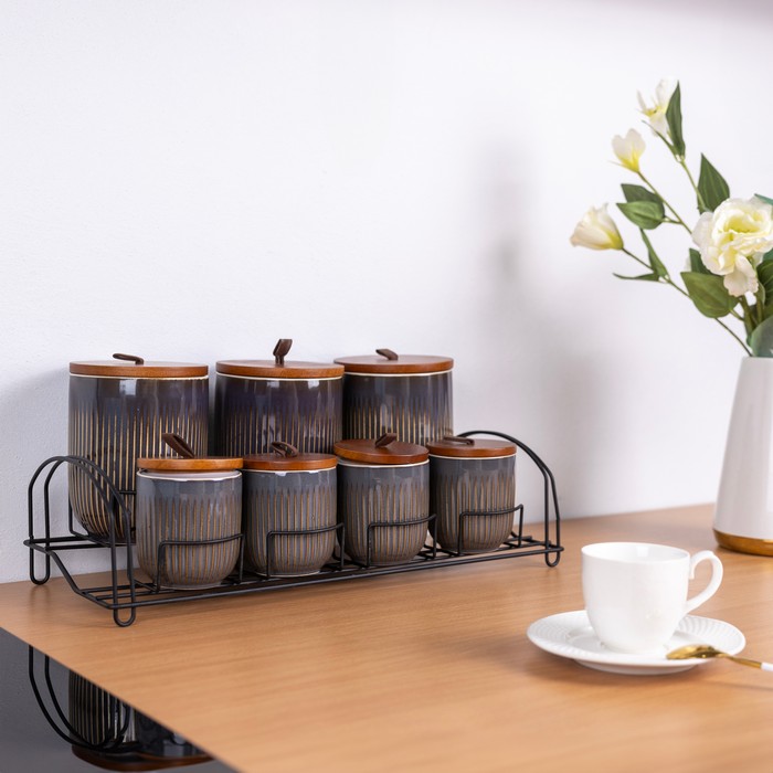 Set recipient depozitare, GS, 7 piese, Ceramica/Bambus, Cu suport, Gri