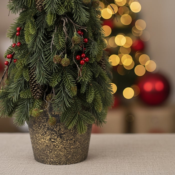 Bradul de Crăciun decorativ GLOBAL CHRISTMAS, cu conuri și pomușoare, adaugă un spirit festiv în casa ta. Reutilizabil și ușor de întreținut, este perfect pentru decorațiuni de Crăciun pe birou, masă sau raft și completează atmosfera sărbătorilor de iarnă.