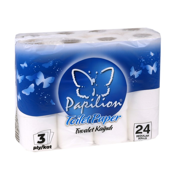 Produs: Hârtie igienică Papilion, 24 role,3 straturi,Foi per rolă: aproximativ 115 foi Material: 100% celuloză pură, fără utilizare de înălbitori chimici Fiecare rolă are dimensiunea de 12x10 cm și este fabricată din ingrediente de calitate superioară, având o textură ultra-fină. Este rezistentă la rupere și este produsă într-un mediu igienic controlat, cu echipamente moderne. Tara de origine:Turcia Importator:Global Store