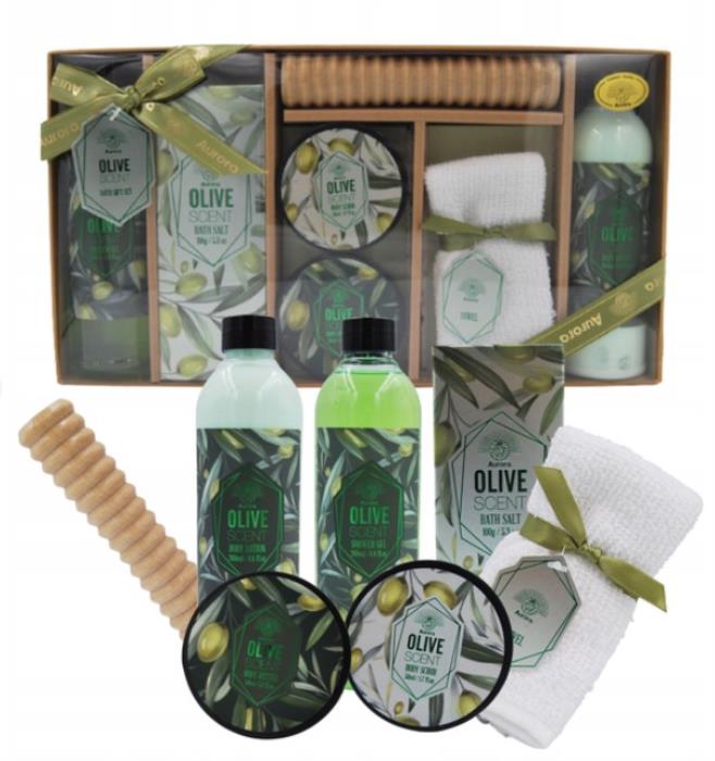 Brand Aurora, furnizor Polonia,Set-cadou Aurora „Olive Garden” este un set de îngrijire corporală destinat ca dar special sau ritual de acasă, cu parfum delicat şi ingrediente inspirate de uleiul de măsline.Conţinutul setului:Gel de duş 260 ml,Balsam pentru corp – 260 ml.Ulei pentru corp 50 ml,Peeling pentru corp - 50ml.Masajer.Prosop inclus pentru utilizare dupa baie.Sare de baie – 100 gr.mportator oficial Global Store,m.Chisinau, str.Calea Iesilor 28/2