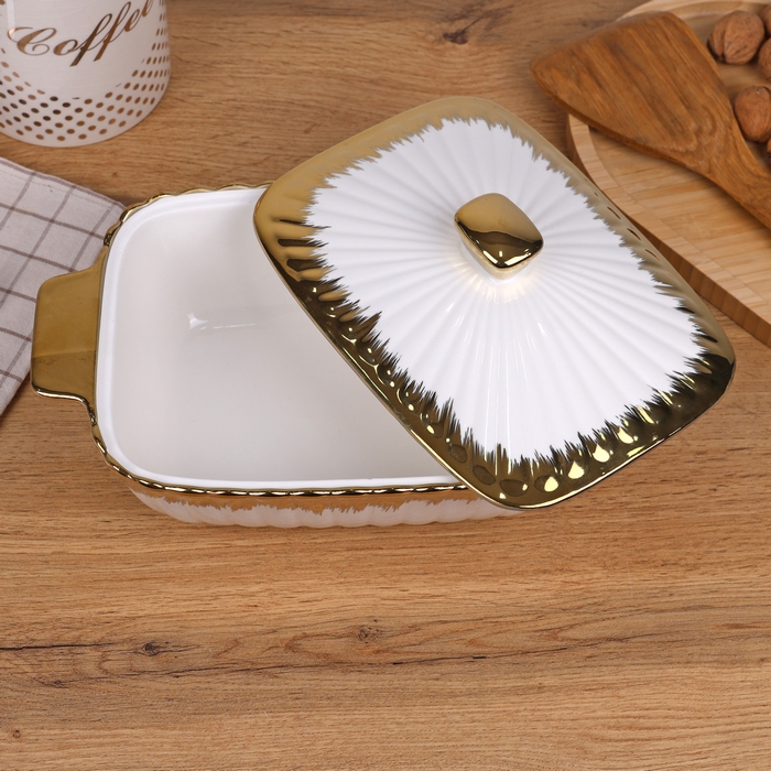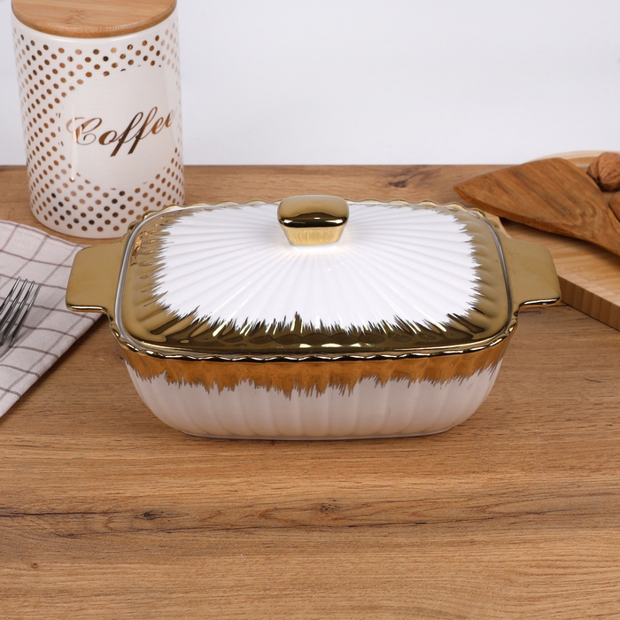 Oala cuptor, GS, Portelan, 31x19x9 cm, Alb/Auriu, Cu capac