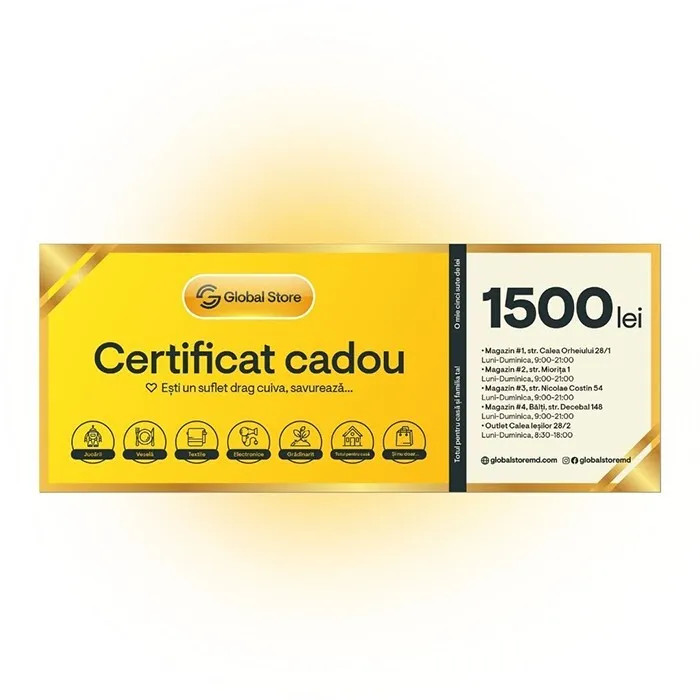 Să alegi un cadou perfect nu e o misiune uşoară. Sunt multe lucruri pe care trebuie să le iei în calcul atunci când dăruieşti, iar noi suntem aici să te ajutăm. Oferă un strop de inspirație persoanelor dragi. Bucură-i cu un certificat-cadou de la Global Store! Te așteaptă la casele de marcat, sau poți să le comanzi online.