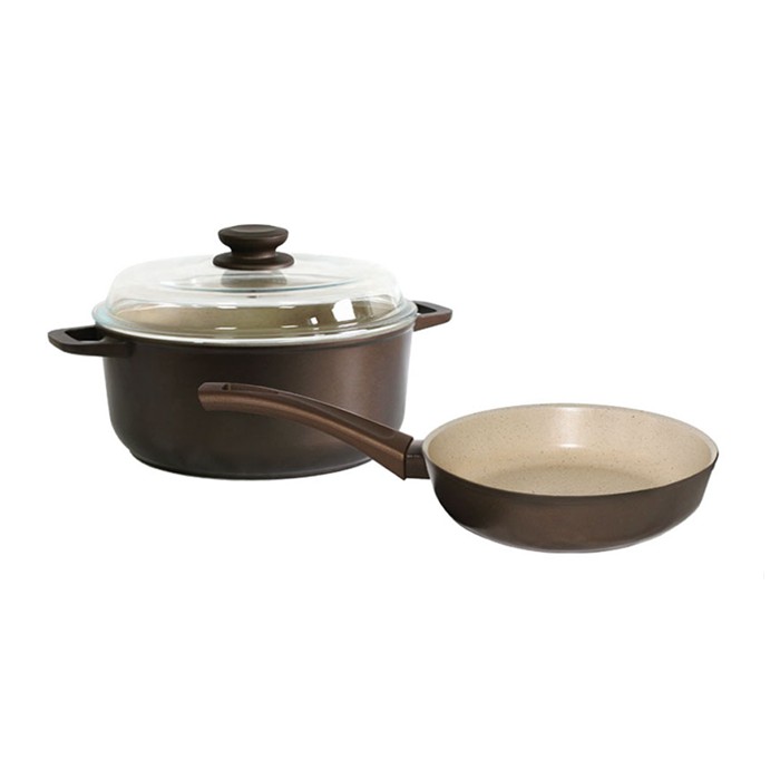 Набор посуды, BIOL, 3Л, 24cм, 3 штук, С крышкой, Стекло, Антипригарный, Алюминий, Металлическая Ручка, Белый/Коричневый