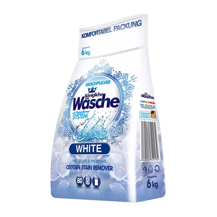 Стиральный порошок "Konigliche Wasche" имеет эффективную формулу с активным кислородом, которая очищает 99 наиболее частых пятен, а также придает вашей одежде длительную свежесть. Стирка одежды становится проще, чем когда-либо. Вес : 6.0кг Количество стирок : 80 (стир.) Аромат : Ромашка Вид одежды : Белое Текстура : Порошок