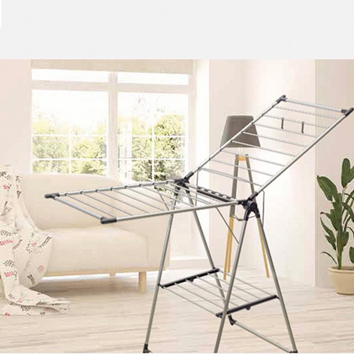 Продукт предлагает дополнительное пространство как по высоте, так и по ширине, устойчив и прочен. Сушилка предназначена для длинной одежды, не касаясь пола. С двумя складными сторонами, которые открываются на максимальную высоту. Можно использовать как в помещении, так и на улице, она безопасена даже при слабом ветре. Рекомендации: * Равномерно распределите белье по всей поверхности. * Хранить во влажных помещениях. * Сушилку можно чистить мягкой тканью и теплым мыльным раствором, избегая использования моющих средств и абразивных губок.