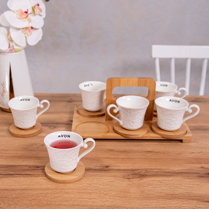 Чайный набор, GS, Фарфор/Бамбук, 170мл, Белый/Коричневый, 6 предметов