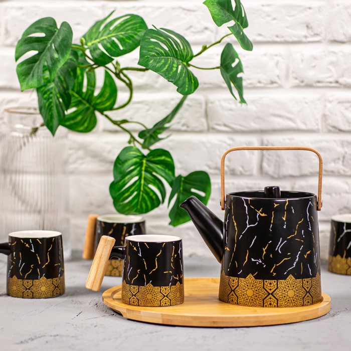 Чайный набор, GLOBAL STORE, Керамика/Бамбук, Черно-коричневый, 1Л, 250мл