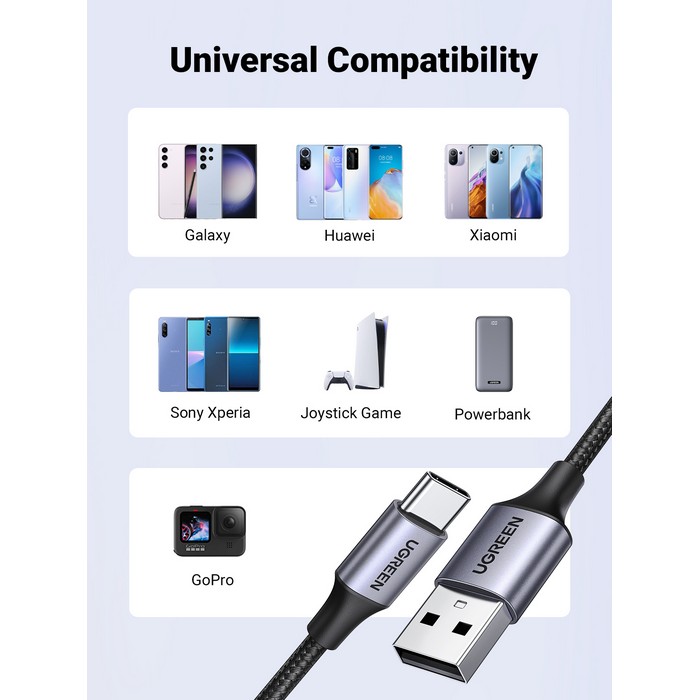 Usb кабель, UGREEN, USB-A to USB-C, 2м, 18 Вт, Медь, Алюминий, Нейлоновая оплетка, Белый
