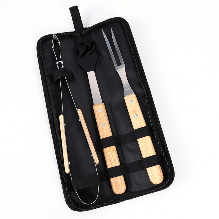 Набор для барбекю, BBQ, 3 предмета, Нержавеющая сталь/Дерево, Деревянная ручка, Сумка
