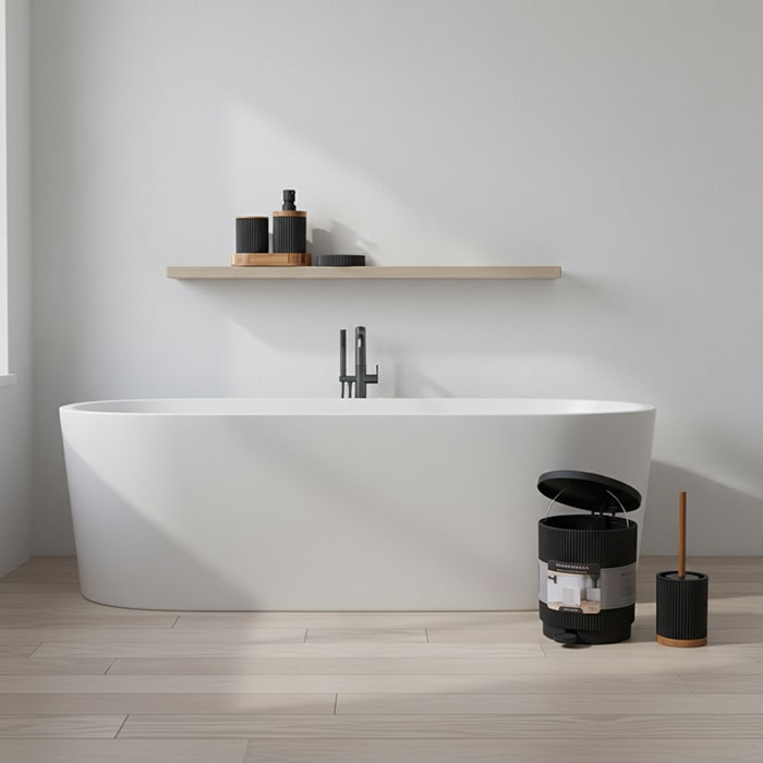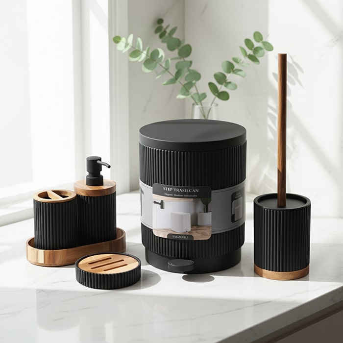 Набор аксессуаров для ванной комнаты, GS, 6 предметов, Пластик/Бамбук, Черный, Матовый, Круглый