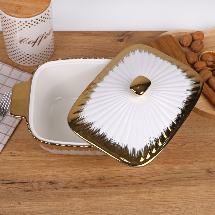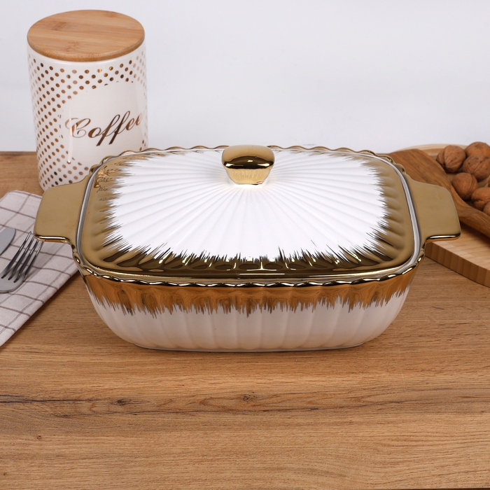 Кастрюля, GS, Фарфор, 33.5x20.5x9.5 cm, Белый/Золотистый, С крышкой